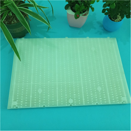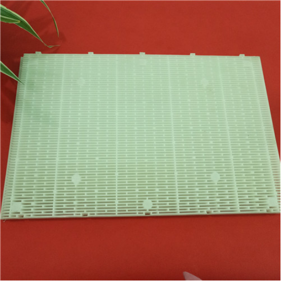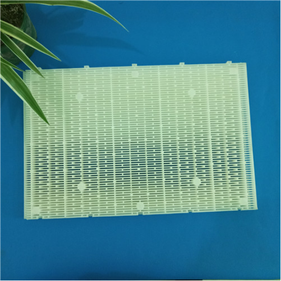 D型濾池過濾板是一種D型濾池里和彗星濾料配合使用的一種過濾裝置,用于固液分離,為了防止濾料再反沖洗過程中流失。并且可以阻止二沉池浮渣對濾料的影響,提高了濾池的產水能力。其間隙為1.5~1.8mm,可以阻止陽光的直射,減緩濾料中藻類的生長。但上部蓋板表面藻類生長還是比較明顯,因此對于污水廠二級生化處理出水需要增加過濾單元時,建議增加頂蓋遮陽和設置殺藻、殺生物膜藥劑,如:次氯酸鈉、二氧化氯等。